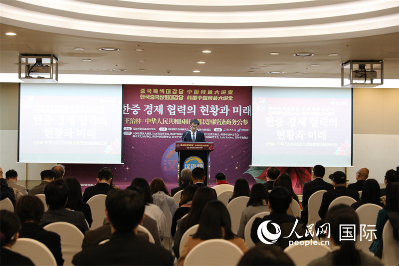 人民日报首尔11月14日电(记者满九辰)由首尔中心俱乐部“汉语桥”与韩中商工会议所共同主办的“中国专题会议”14日在韩国首尔举行。此次活动旨在让韩国界更深入、更权威地解读中国经济社会发展情况,促进两国在经贸、城镇交流等领域务实交流。汉语桥俱乐部首尔中心会长李正恩、韩国现代华人学会副会长李俊植、韩中商工会议所会长高晨、韩国在华校友会会长刘在润等中韩两国人士120余人出席活动。图为“中国特色大礼堂”活动。人民日报记者满九辰供图。在这次活动中,我们特别邀请中国驻韩国大使馆公使衔参赞王志林发表主旨演讲。他以“中韩经贸合作的现状和未来”为题,对当前国际形势、中国经济发展新趋势以及两国产业链合作前景进行了详细解读。王志林在致辞中表示,中韩是密不可分的近邻,也是利益交融、互利共赢的优质伙伴。两国产业链、供应链深度融合,形成“你中有我、我中有你”的合作局面。他还强调,在两国领导人战略引领下,中韩关系成功翻开新篇章,中韩经贸合作也站在新的历史起点。两人算双方应继续加深相互了解和信任,合作开拓新的合作领域,共同维护产业链供应链稳定,共同努力提高中韩经贸合作质量和稳定性。图为中韩嘉宾合影。人民网记者 满九辰 供图 与会人员普遍认为,“中国特色大讲堂”活动形式新颖、内容丰富,不仅加深了对中国发展的了解,也为未来务实合作提供了新视角。各界人士希望今后继续开展高质量的交流活动,进一步促进两国经贸合作和民间友好交流。